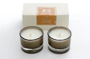 Beautifully vintage, yet uniquely modern gift box contains two votive candles encased in smoke-brown glass.