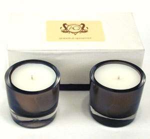 Beautifully vintage, uniquely modern gift box contains two votive candles encased in smoke-brown glass.