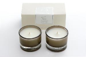 Beautifully vintage, yet uniquely modern gift box contains two votive candles encased in smoke-brown glass.
