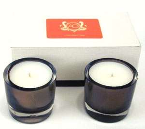 Beautifully vintage, uniquely modern gift box contains two votive candles encased in smoke-brown glass.