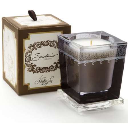 This candle comes in a keepsake encased glass vessel with an embossed glass lid that can be used as a base or to extinguish the candle.