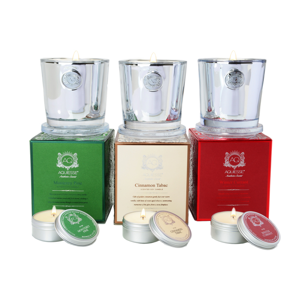 The AQUIESSE Soy Holiday Candle Collection uses a proprietary soy wax blend developed by Aquiesse through years of creating unique and fragrant soy candles. This soy wax blend allows for quick fragrance release and long burn time. Made with organic soybean oil and carefully selected lead-free wicks, Aquiesse candles are unsurpassed in burn quality and fragrance performance.