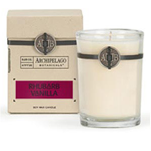 Fill your home with the rich blends of Archipelago. Each candle is hand poured using the finest ingredients and fragrance oils available. The unique wax blend is more than half natural soy wax, which burns longer and cleaner than regular paraffin or beeswax. Each 5.25 oz. candle burns for about 50 hours. Remember the first time you tasted rhubarb pie? Bring home the fragrant freshly-baked aroma with Rhubarb Vanilla. Sweetly homey, it's a calorie-free way to enjoy your dessert!