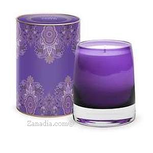 Colorful cased glass vessels filled with the highest quality soy blend waxes and pure cotton wicks come ready for gift giving in lovely intricately imprinted boxes with gilded details.