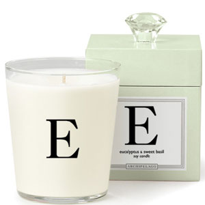 This hand poured soy wax blend fills the room with the rich fragrance of the essential oil each letter inspires, burning for more than 60 hours. Packaged in a keepsake monogrammed box topped with a decorative crystal knob, each candle is monogramed on its surrounding glass as well and holds the unique scent of its individual letter. "E" is for Eucalyptus & Sweet Basil in a sweet pastel green box; very sweet and fresh.