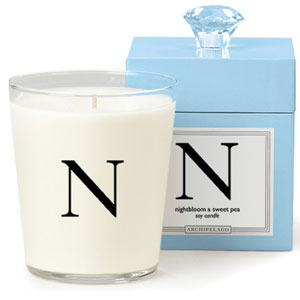 This hand poured soy wax blend fills the room with the rich fragrance of the essential oil each letter inspires, burning for more than 60 hours. Packaged in a keepsake monogrammed box topped with a decorative crystal knob, each candle is monogramed on its surrounding glass as well and holds the unique scent of its individual letter. "N" Nightbloom & Sweet pea in a charming pastel blue box; this scent surrounds you.