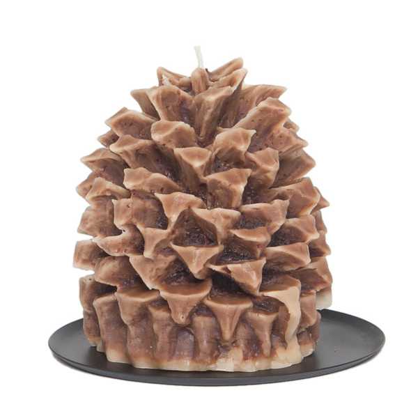 -A beautifully scented large pinecone candle with over 80 hours of burn time. Comes with an antiqued round metal plate for an authentic look and presentation.