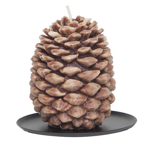 -A beautifully scented large classic pine-cone candle with over 40 hours of burn time. Comes with an antiqued round metal plate for an authentic look and presentation.