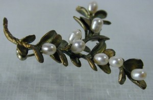 Bronze with white pearls. 2-inch hinged sections. Clasp closure.