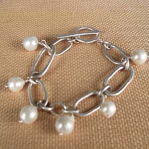 A very organic bracelet with different sized links and a hammered texture combined with large Fresh Water Pearls. Toggle Closure.