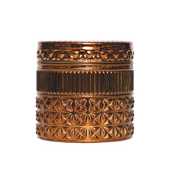 Metallic colors are applied to these faceted glass vessels for a dramatic effect. The glass lids keep your candle fresher longer. Refining naturally pure soy wax to food grade purity produces a base with very low oil content that it absorbs twice as much fragrance oils as a typical candle resulting in very fragrant candles with clean super slow burn.