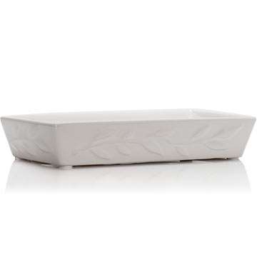 Accessorise your counter and have easy access to your favorite fragrance. A rectangular ceramic sink set holder with an embossed branch & leaves design, made to hold a hand wash and hand lotion by your kitchen or bathroom sink for easy access. .