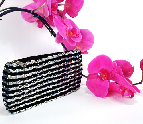 Elegant and funky, the Chica Rosa is a chic metallic evening bag with an eco-twist. Hand crocheted with over 200 recycled aluminum pop-tops. Comes with nylon fabric liner, YKK zipper closure.