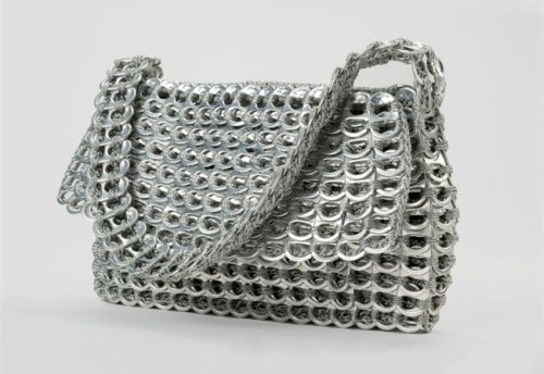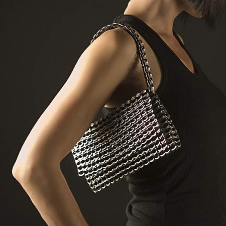 Elegant and funky, the Francisca is a chic metallic evening bag with an eco-twist. Hand crocheted with over 500 recycled aluminum pop-tops. Comes with nylon fabric liner, YKK zipper closure, strap with hand crocheted padding. An external flap covers the zipper.