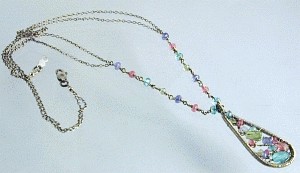 Spring Mix gem beads are woven inside 3 cm teardrop frame. Small gems accent the chain at intervals.