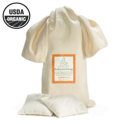 USDA Organic Skin Care. A unique and natural product. This organic baby wash bag contains 20 unbleached muslin sachets filled solely with organic herbal ingredients. Organic oats, milk & lavender make it the gentlest way to clean baby's skin. Simply use as a washcloth for the ultimate in gentle, soapless washing. Ideal for the first bath or for any sensitive skin.