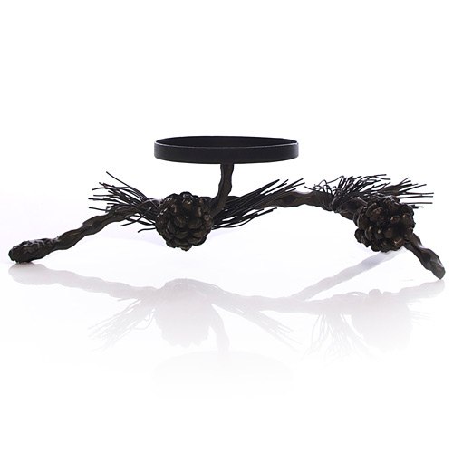 Bronze metal boughs and pinecones adorn this candleholder creating a gorgeous centerpiece for a dining table or your fireplace mantle.. Matched beautifully with the Frasier Fir poured candle ( # 16975) to create a beautiful statement in your home, or a most fabulous holiday gift. Candle sold separately.