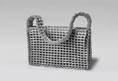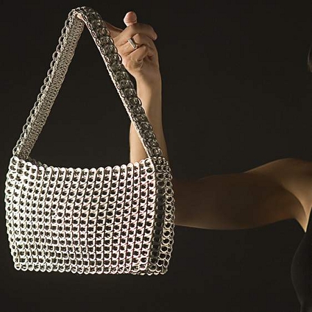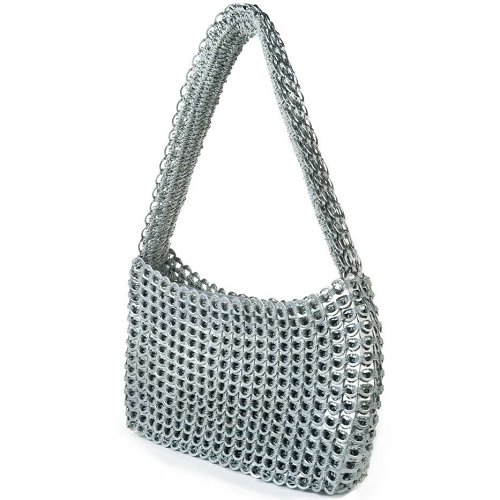 Wear it as a functional day bag or as an elegant evening bag and prepare yourself for lots of attention. Hand crocheted with over 700 recycled aluminum pop-tops. Lightweight and supple, it comes with nylon fabric liner, YKK zipper closure, one inside zipped pocket, strap with hand crocheted padding.