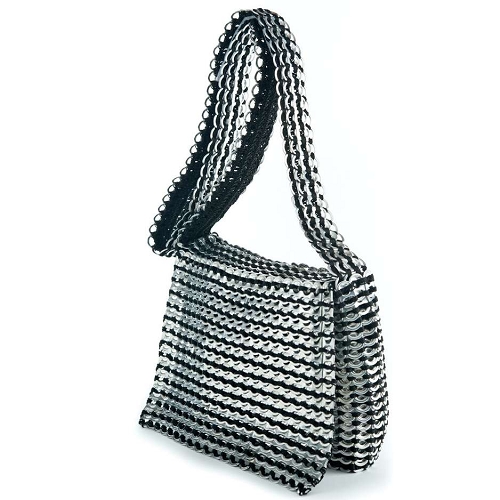 Designed for women who like to keep their hands free, the Masha slings across the chest and hangs comfortably on your hip. Supple and lightweight, it's hand crocheted with over 1,600 recycled aluminum pull-tabs. Comes with nylon fabric liner, YKK zipper closure, one inside zipped pocket, shoulder strap with hand crocheted padding.
