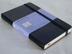 The notebooks are bound in cardboard, a 'Moleskine' cover and the acid free pages are thread bound. They also have an elastic closure and an expandable inner note holder made of cardboard and cloth and a removable card with the Moleskine history.