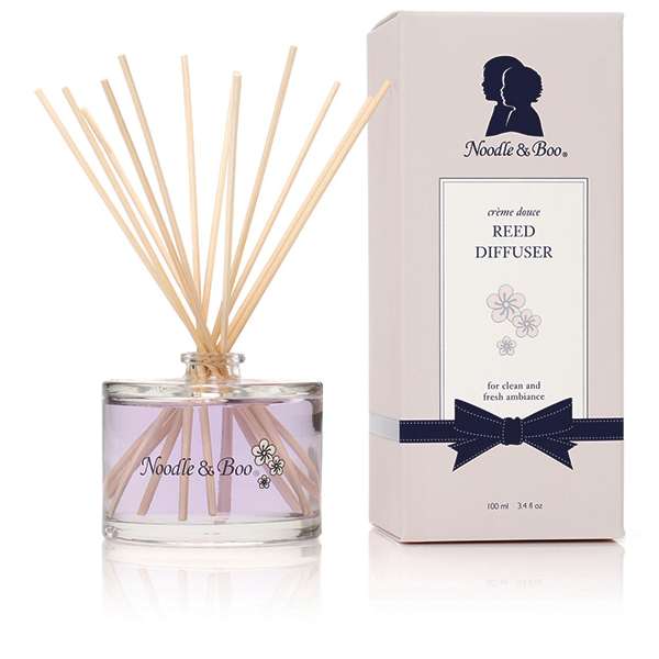Noodle & Boo's signature Creme Douce fragrance combines a fresh blend of peach and water blossoms, with just a touch of ripe mixed berries and clover honey, wrapped in soft notes of rich warm milk and vanilla beans. Directions: Remove the bottle cap and place the decorative ring on top of the bottle. The reeds will naturally draw and diffuse the fragrance. To refresh, remove the reeds and place opposite ends in the fragrance.