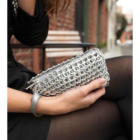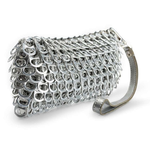Elegant and funky, the Francisca is a chic metallic evening bag with an eco-twist. Hand crocheted with over 500 recycled aluminum pop-tops. Comes with nylon fabric liner, YKK zipper closure, strap with hand crocheted padding. An external flap covers the zipper.