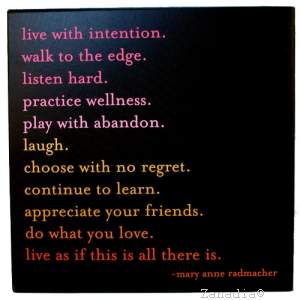Quote Reads: Live with intention Walk to the edge Listen hard Play with abandon Laugh Choose with no regret. Continue to learn Appreciate your friends Do what you love Live as if this is all there is..