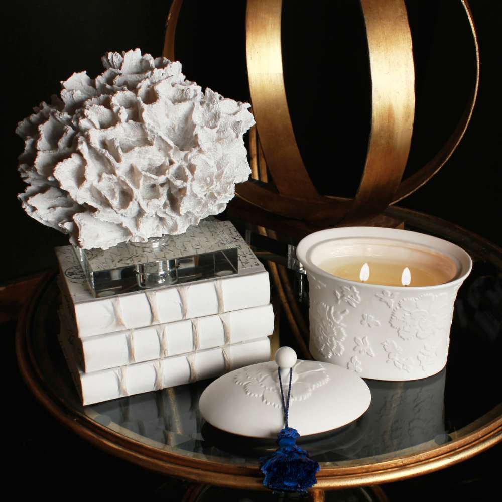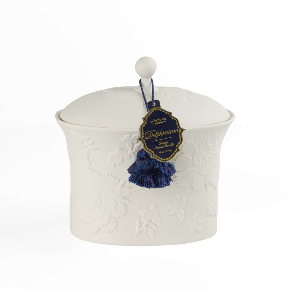 Two wicks light up this embossed oversized candle from Seda France. A cobalt blue tassle adds a decorative touch, while the two wicks allow for extra fragrance throw from this impressive and elegant candle.