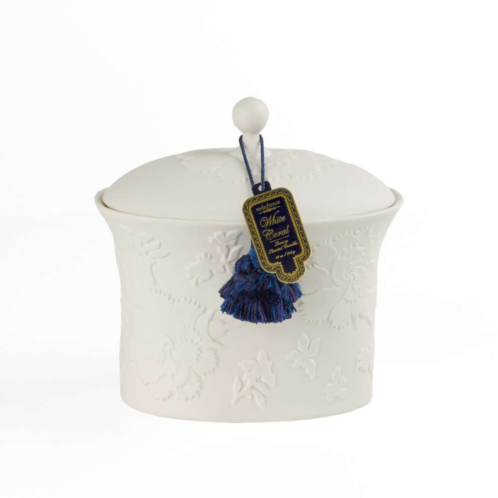 Two wicks light up this embossed oversized candle from Seda France. A cobalt blue tassle adds a decorative touch, while the two wicks allow for extra fragrance throw from this impressive and elegant candle.