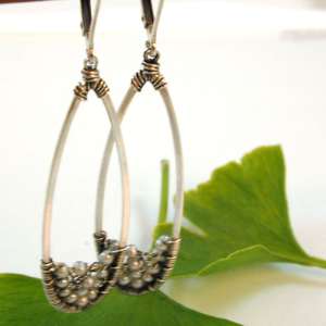 Tear drop wire wrapped Platinum Pearls Earrings in Sterling Silver.