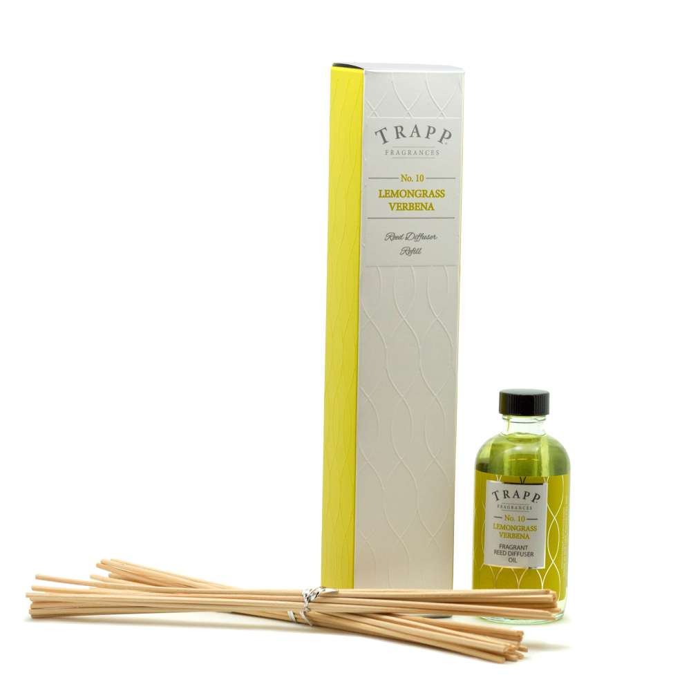 Trapp Candles No 10-Lemongrass Verbena, Reed Diffuser Refill and Reeds. Crisp citrus notes extracted from Asian lemongrass complemented by Brazilian verbena and softened with base notes of vanilla.