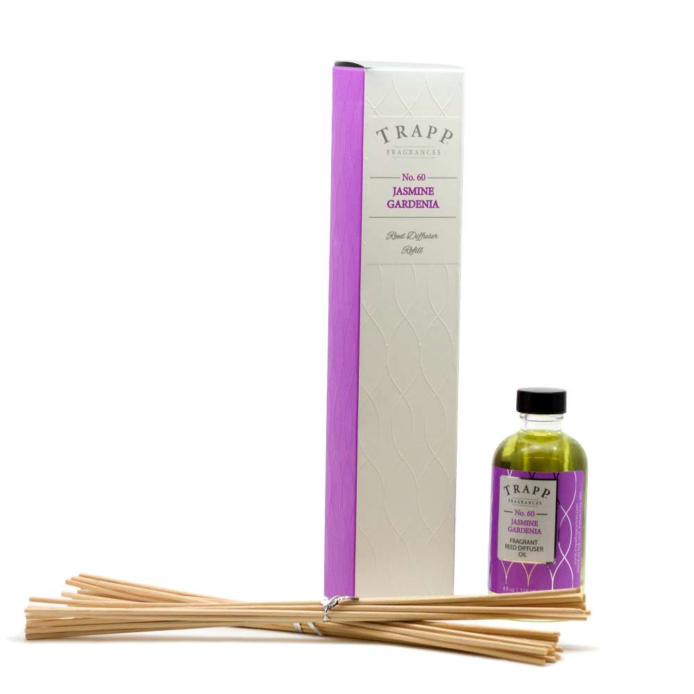 Trapp Candles No 60-Jasmine Gardenia, Reed Diffuser Refill and Reeds. Classic, sophisticated and stylish. An exquisite combination of the timelessness of jasmine and the heart notes of gardenia with a hint of honeysuckle top notes.