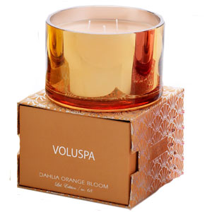 Voluspa Seasons 3-Wick Color Metallic Candle in Velvet Box - Dahlia Orange Bloom.