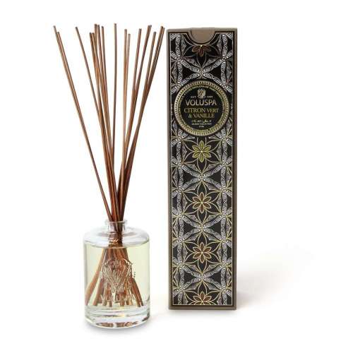 Voluspa Citron Vert diffuser in an elegant substantial clear embossed glass bottle with a glass stopper.