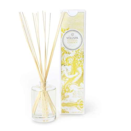 Voluspa Maison Elysian Garden diffuser in an elegant substantial clear embossed glass bottle with a glass stopper.