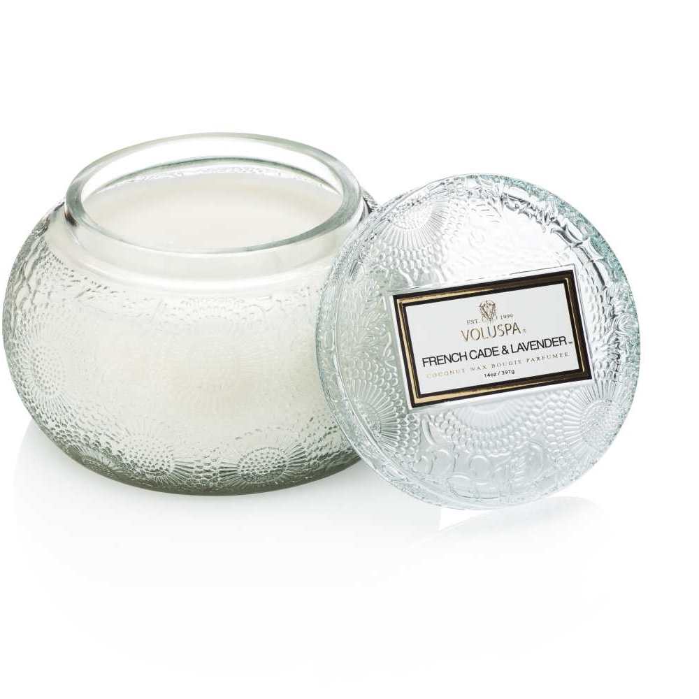 Made of perfumed natural coconut wax poured in an embossed glass jar with lid. Modeled after the Traditional Japanese Chawan rice bowl, and embossed with the Classic Voluspa Japonica design.