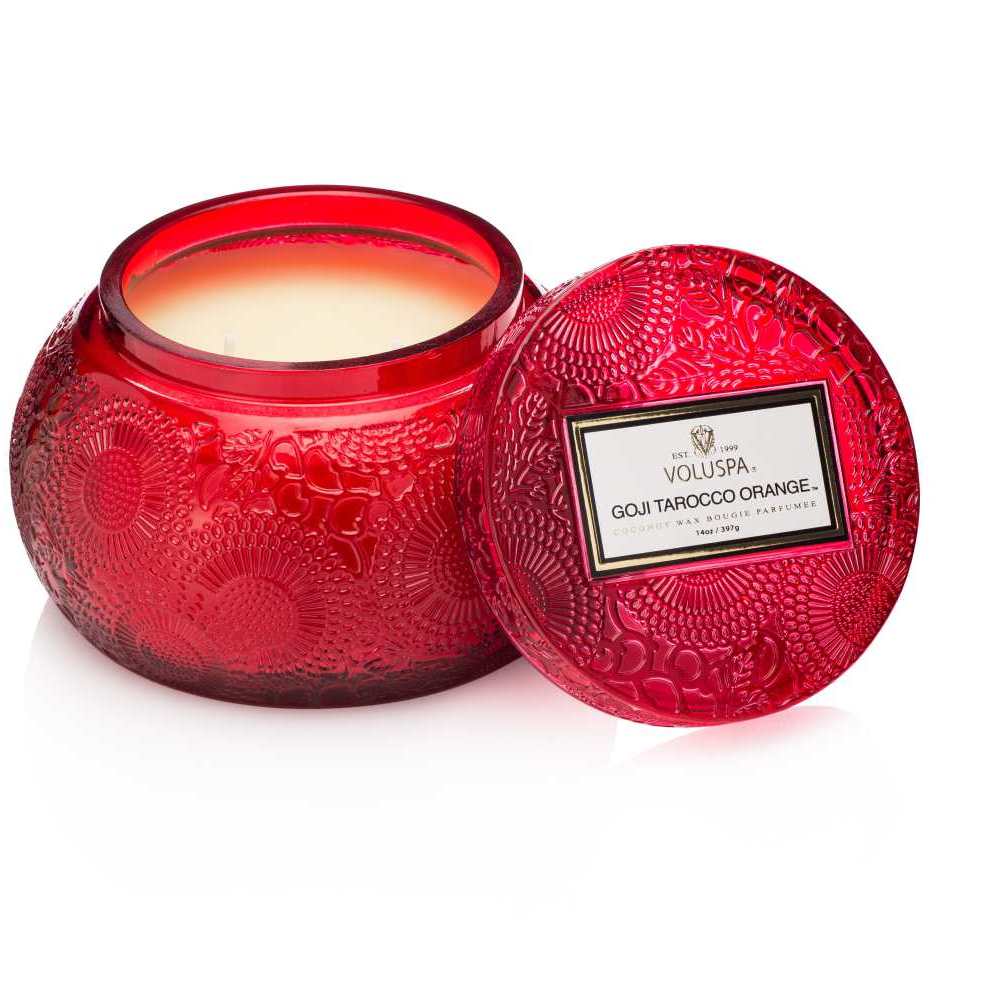 Made of perfumed natural coconut wax poured in an embossed glass jar with lid. Modeled after the Traditional Japanese Chawan rice bowl, and embossed with the Classic Voluspa Japonica design.