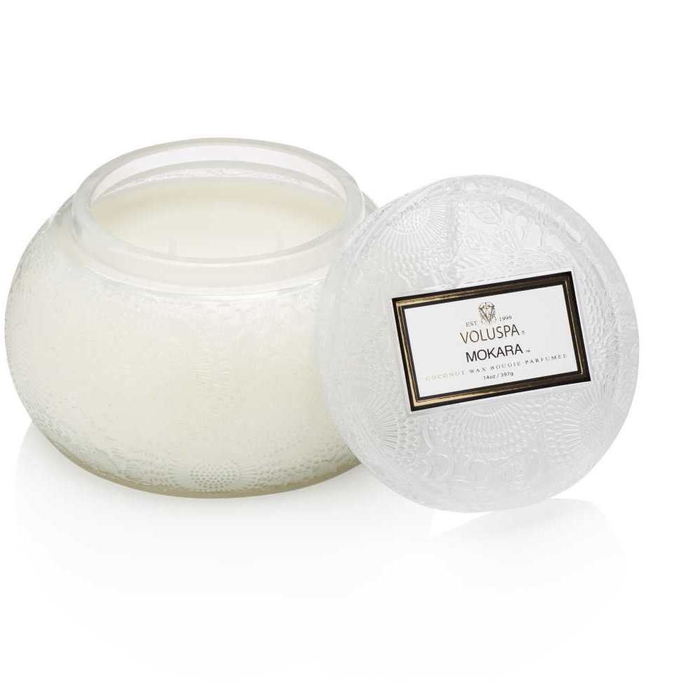 Made of perfumed natural coconut wax poured in an embossed glass jar with lid. Modeled after the Traditional Japanese Chawan rice bowl, and embossed with the Classic Voluspa Japonica design.