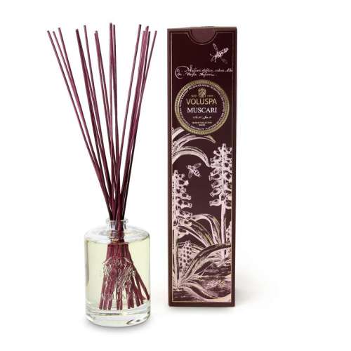 Voluspa Maison Muscari diffuser in an elegant substantial clear embossed glass bottle with a glass stopper.