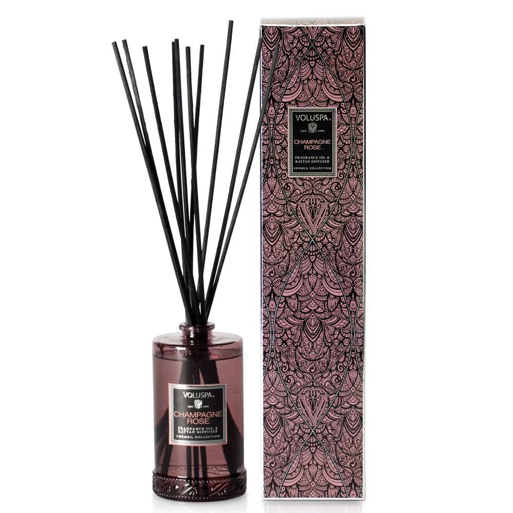 Champagne Rose is now Prosecco Rose . Fragrant oil reed Oil Diffuser in a distressed and speckled vintage silver vermeil glass vessel. As impressive to give as they are to enjoy these diffusers will fragrance any room for months.