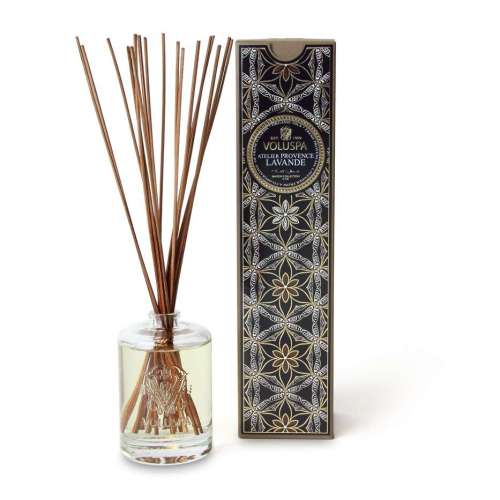 Voluspa Provence Lavande diffuser in an elegant substantial clear embossed glass bottle with a glass stopper.