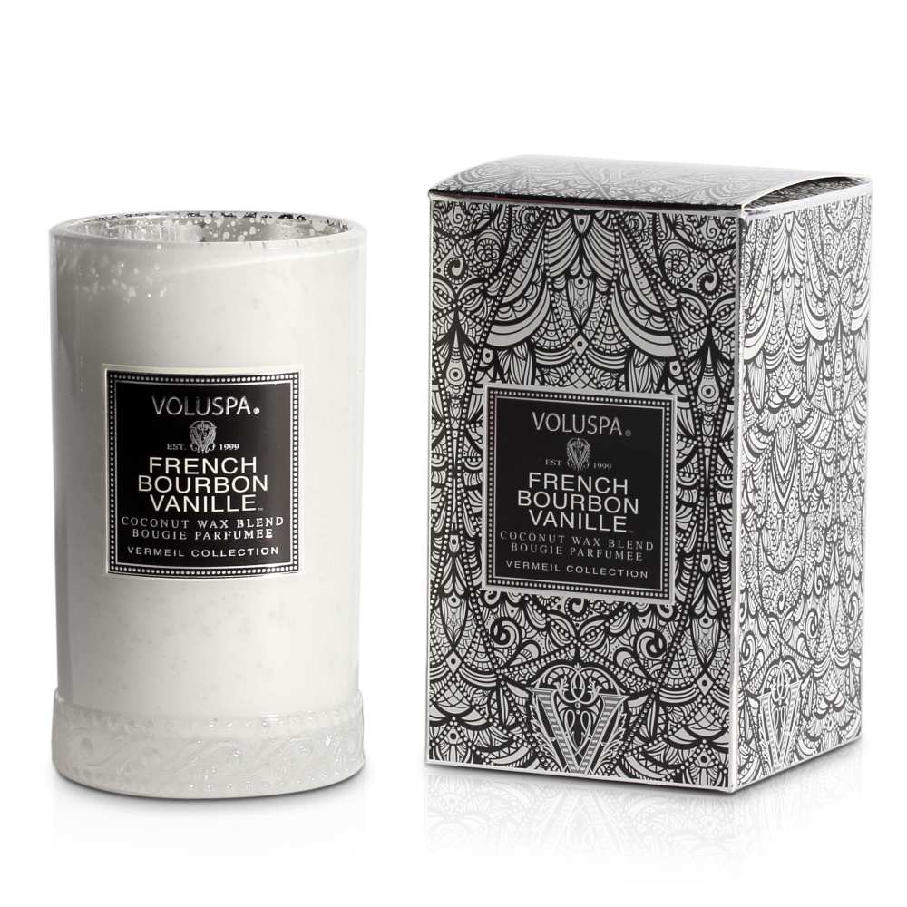 Distressed and speckled vintage silver vermeil graces these glass candles. Exclusive formulation of the highest quality waxes and fragrances fill these graceful glass shapes. Use this petite slender glass candle for the holidays or any time of year. The vermeil collection is to be treasured, cherished and shared.