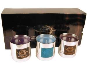 One 5-ounce candle each of Makassar Ebony Peach, Snowflakes and French Bourbon Vanille in a box perfect for giving.