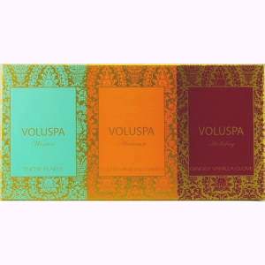 Voluspa's delightfully luscious holiday fragrances are available as a boxed set, perfect for gift-giving or treating yourself and your home! The three-candle set includes Winter, Autumn, and Holiday..