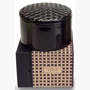 A generous 20 oz. three wick candle in a Luxe black ceramic bowl with an elegant pattern embossed lid. This candle will fragrance a room like no other leaving a lasting scent of your favorite fragrance in even the largest space. The supreme quality, cool burning soft wax formulation lends to the creation of an extended 120 hour burn time. Re-use the decorative container when the candle is gone. Fleur de Cocoa blends darch rich bitter Chocolate and Sweet Almond into aroma perfection with Tuberose and Honeysuckle. Creme frosting adds a fresh baked warm center.