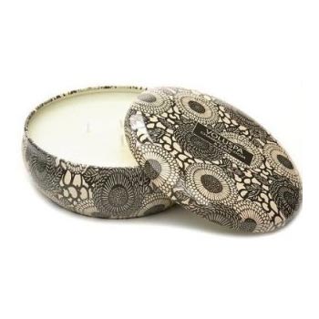 12-ounce candle in decorative shallow metal bowl with extinguishing lid.