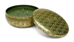 12 oz. candle in a sophisticated, festive shallow metal bowl with extinguishing lid.