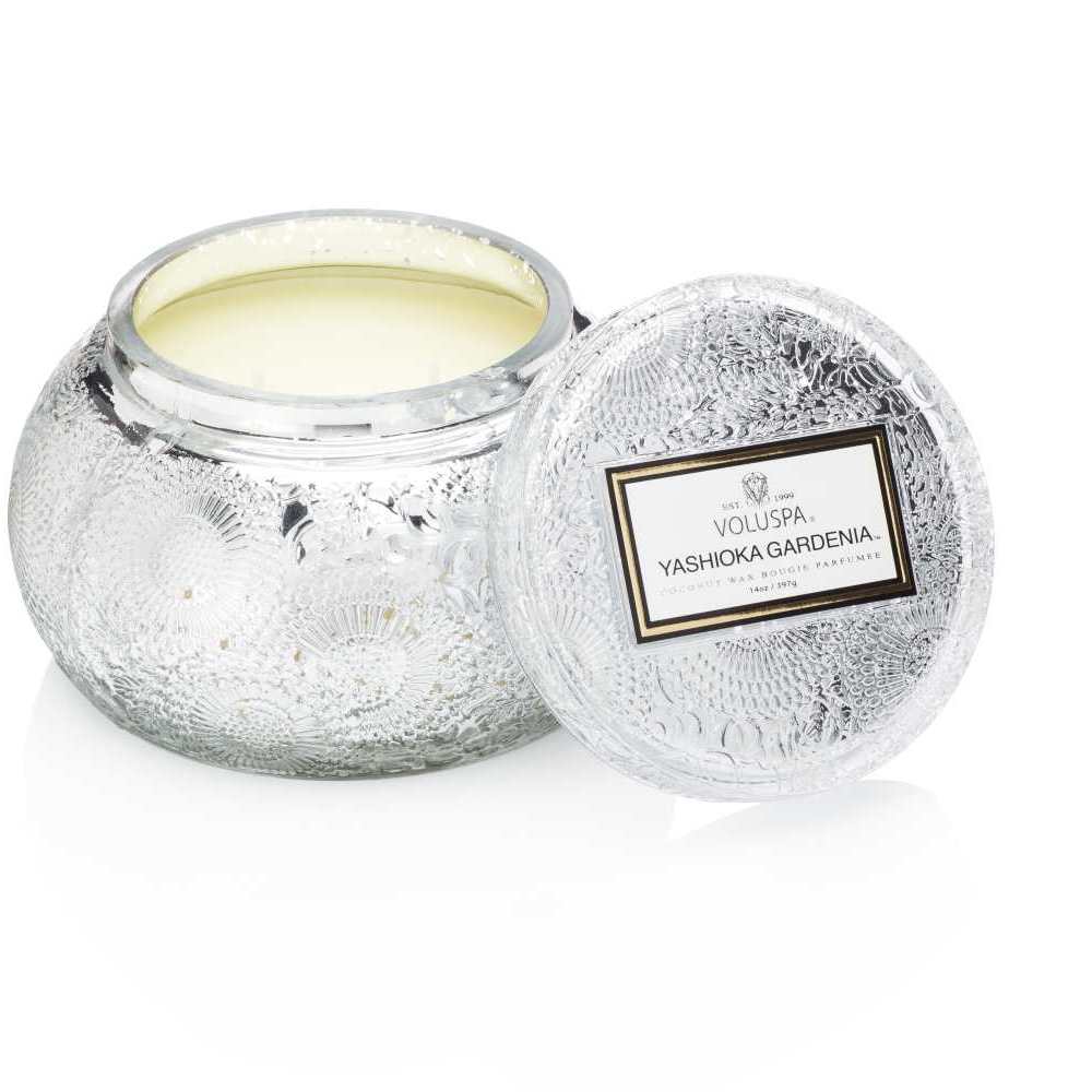 Made of perfumed natural coconut wax poured in an embossed glass jar with lid. Modeled after the Traditional Japanese Chawan rice bowl, and embossed with the Classic Voluspa Japonica design.