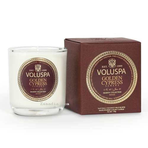 Voluspa Maison Golden Cypress Sawara Boxed Votive in heavy cased glass.