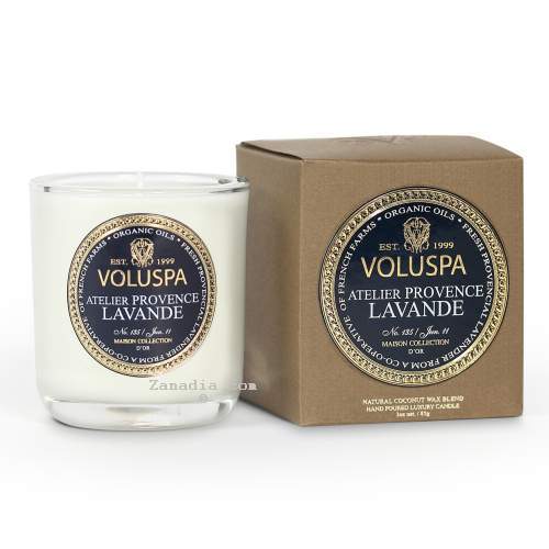 Voluspa Provence Lavande Boxed Votive in heavy cased glass.